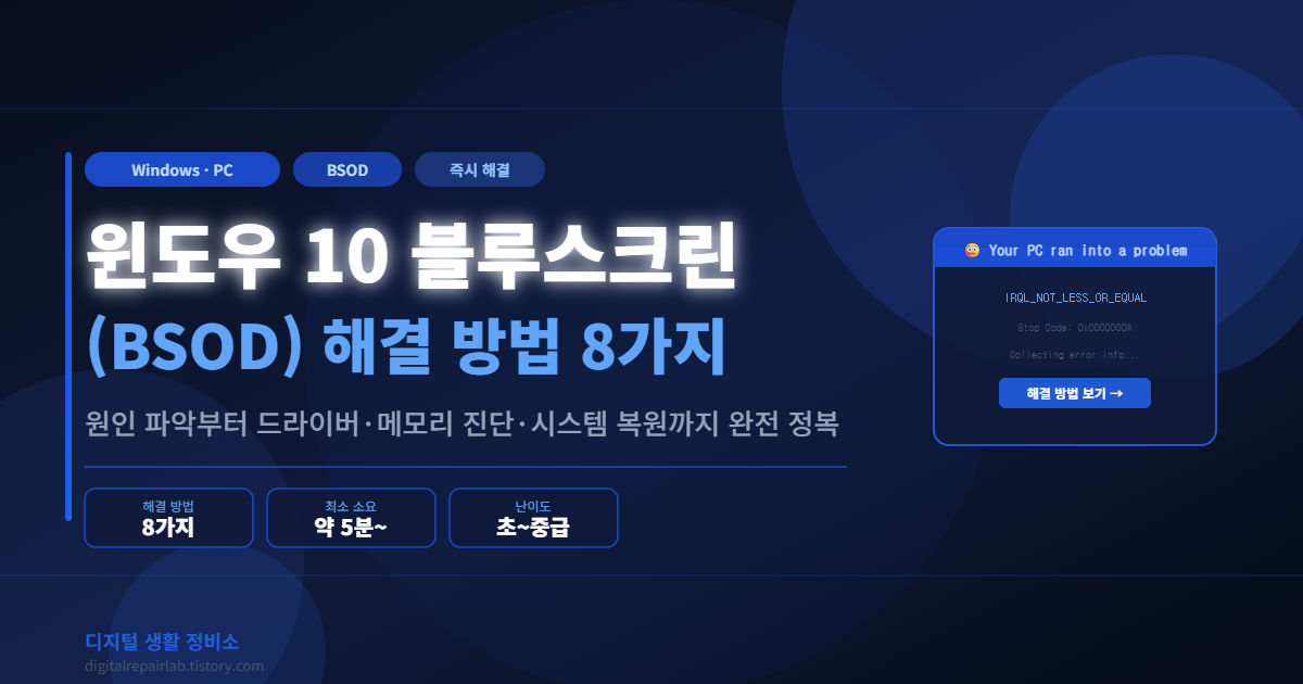 작업하던 파일을 저장하려는 순간, 혹은 게임 중 갑자기 화면이 파랗게 변하면서 "당신의 PC에 문제가 발생하여 다시 시작해야 합니다"라는 메시지가 뜰 때 — 그 황당함과 허탈함은 직접 겪어본 분들만 아실 거예요. 혹시 중요한 데이터가 날아간 건 아닐까, 컴퓨터가 완전히 망가진 건 아닐까 걱정이 밀려오죠. 하지만 너무 걱정하지 마세요! 블루스크린(BSOD)은 대부분 집에서 충분히 해결할 수 있는 오류입니다. 지금부터 차근차근 함께 해결해 봅시다.